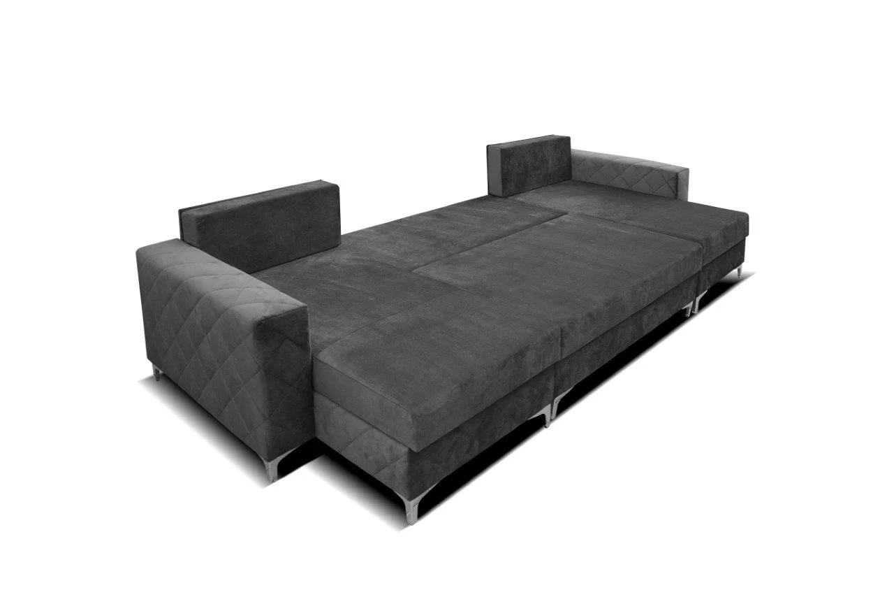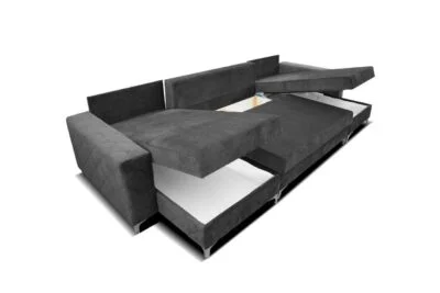 Narożnik jest bardzo praktyczny, ponieważ posiada pojemnik na pościel, który z łatwością pomieści dodatkowe koce i poduszki. Funkcja spania jest dodatkowym atutem tego mebla, dzięki czemu możesz go w prosty sposób przekształcić w wygodne łóżko dla gości.