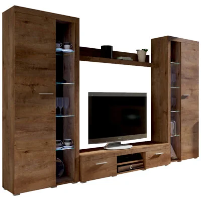Rumba XL składa się z różnych elementów, w tym szafki RTV, półek wiszących, szafek i półek stojących, tworząc spójny i harmonijny zespół. Każdy z tych elementów oferuje przestrzeń do przechowywania, umożliwiając łatwe zorganizowanie wszystkiego, od książek i multimediów, po dekoracje i pamiątki.